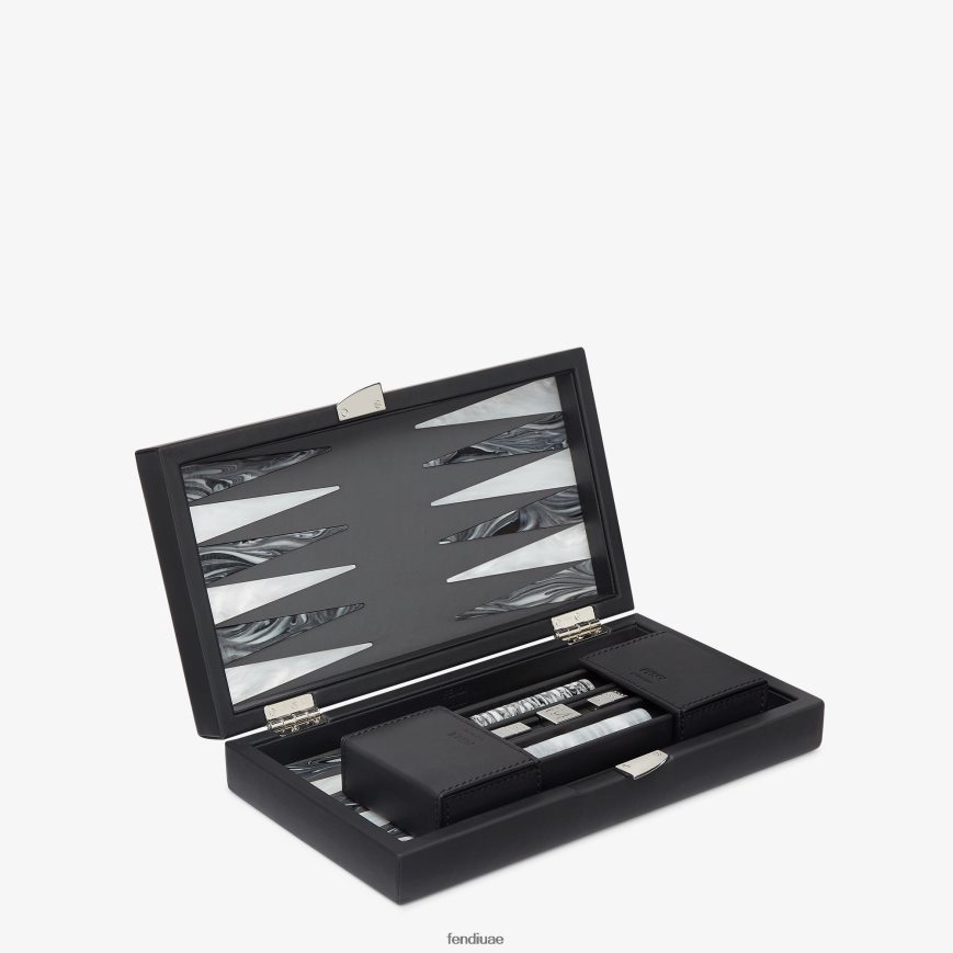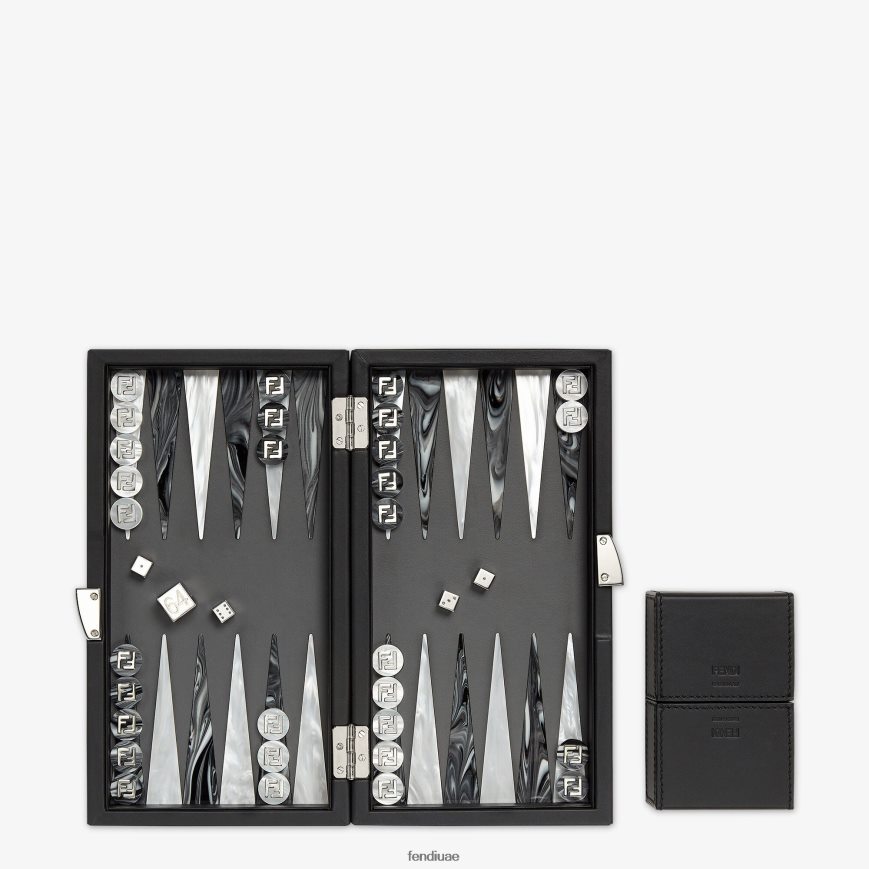 لعبة الطاولة مصنوعة من قماش ff باللونين الأسود والرمادي مع تفاصيل من الجلد الأسود وبطانة زجاجية باللونين الرمادي والأبيض. رموز زجاجية مزينة بتفاصيل معدنية. أدوات معدنية مطلية بالبلاديوم.