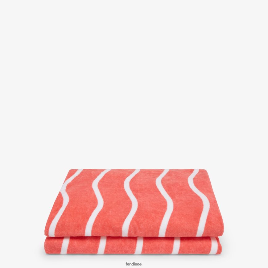 منشفة شاطئ مستطيلة. مصنوع من قطن تيري باللون الوردي مع رسم تنجيم فندي بألوان متباينة.