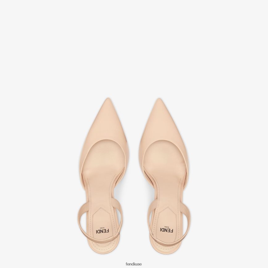 أحذية فندي الأولى ذات مقدمة مدببة وحزام للكاحل. مصنوع من الجلد الوردي الفاتح. كعب منحوت على شكل حرف F من المعدن الذهبي اللون.