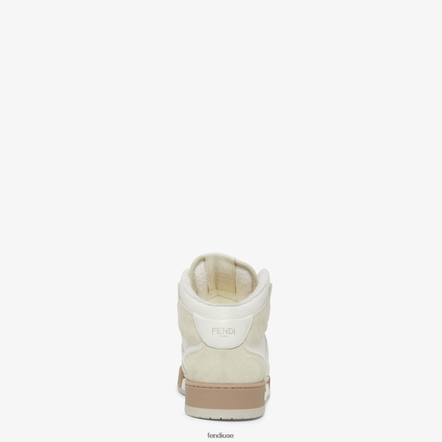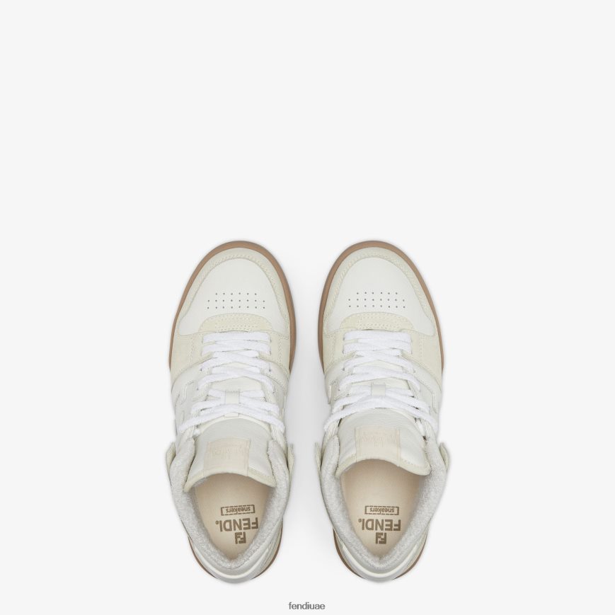 أحذية فندي الرياضية ذات الأربطة. مصنوع من الجلد الأبيض مع تفاصيل من جلد الغزال باللون الرمادي الفاتح. نعل مطاطي مع حروف فندي على الجانب.