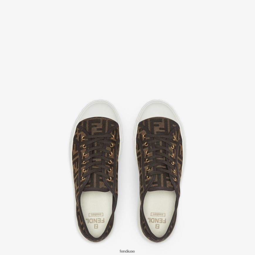 حذاء رياضي فندي دومينو مدمج وخفيف الوزن. مصنوع من القماش بزخارف جاكار ff باللون البني والتبغ. نعل مطاطي مزين بنقش ff على مقدمة القدم.