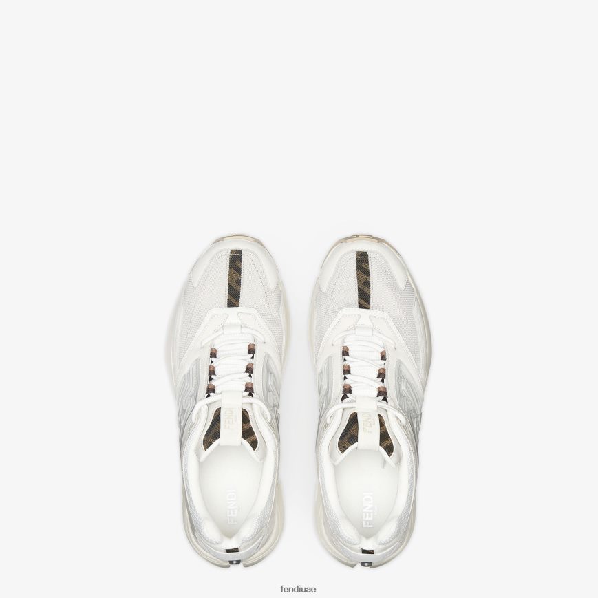 حذاء رياضي Fendi Faster مصنوع من جلد نوبوك الأبيض مع تفاصيل من الجلد والقماش الفني المتطابق وزخرفة FF منقوشة على الجوانب. نعل مموج مع ff على أصابع القدم. مزين بإضافات من القماش باللون البني والتبغ.