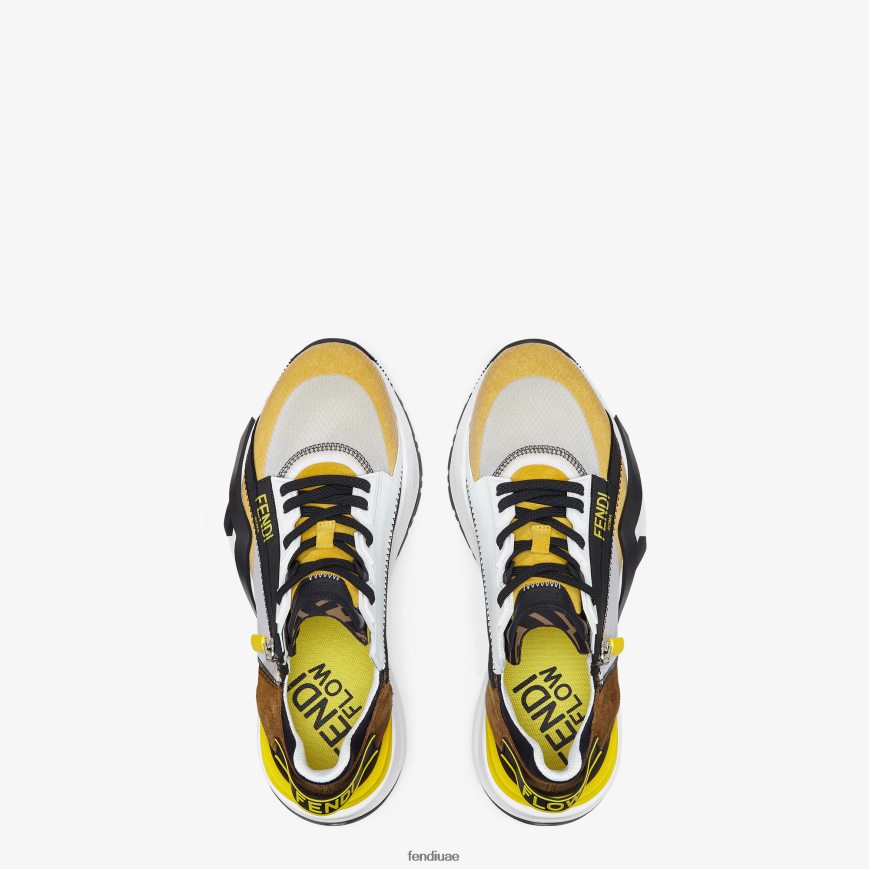 حذاء رياضي سهل الارتداء مع أربطة مطاطية وسحاب جانبي ونعل مموج مع نقش F. حروف فندي المتدفقة منقوشة على الكعب. مصنوع من مزيج من الأقمشة التقنية والجلد المدبوغ باللون الأبيض والأسود والأصفر. مزين بتفاصيل ليكرا. اللسان مع عزر ff. نعل إيفا.