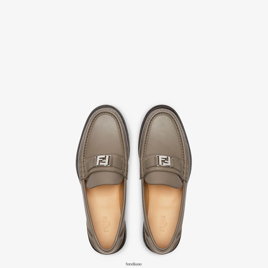 حذاء لوفر بزخارف مربعة ff. مصنوع من الجلد البيج. باطن جلدية. أدوات معدنية مطلية بالبلاديوم.