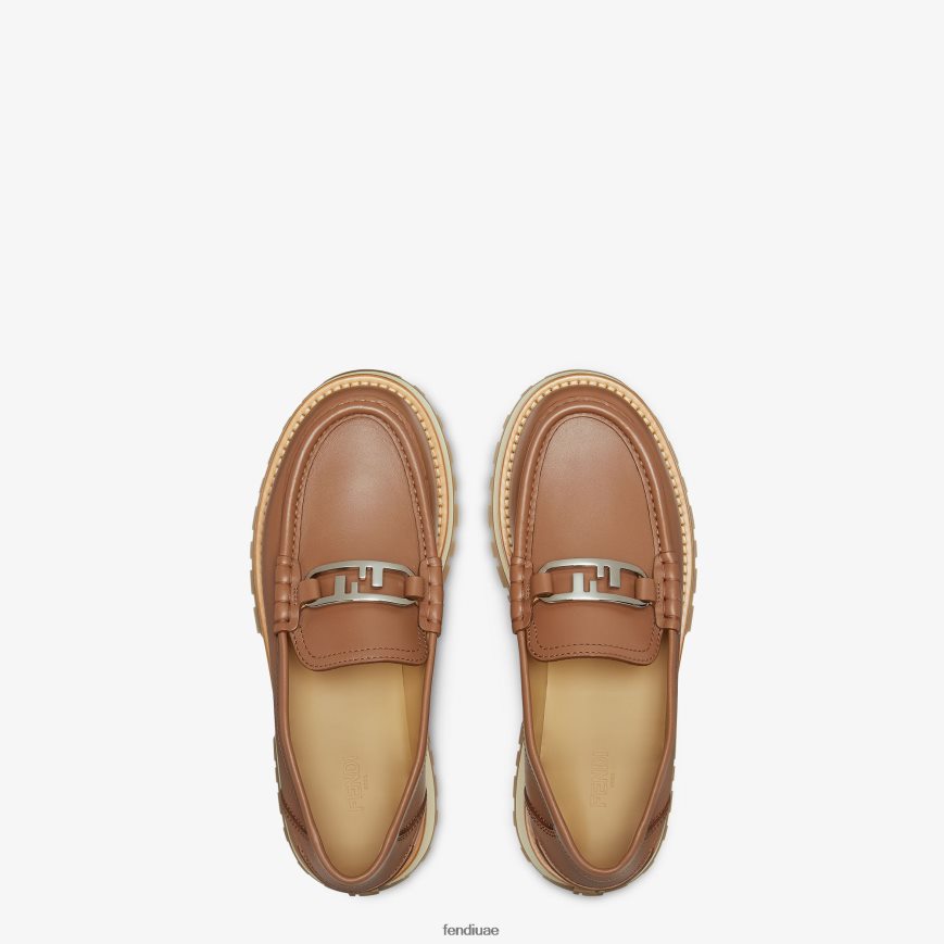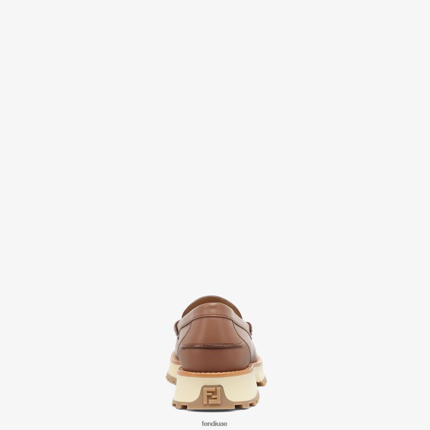 حذاء لوفر مع ساحة حذاء مخيطة بشكل مرئي وجزء علوي مزين بتفاصيل فندي أولوك. مصنوع من الجلد البني. إكسسوارات معدنية مطلية بالبلاديوم. نعل مطاطي منقوش.