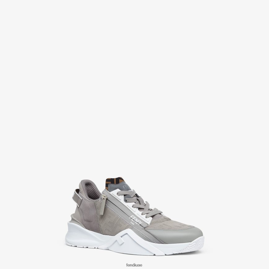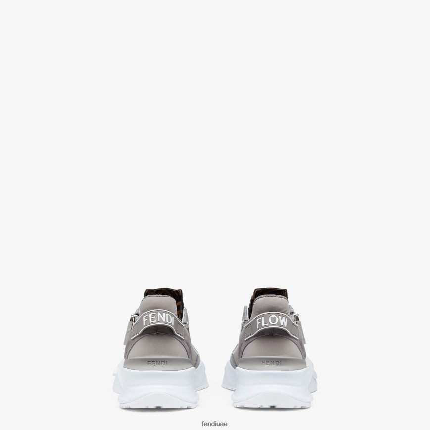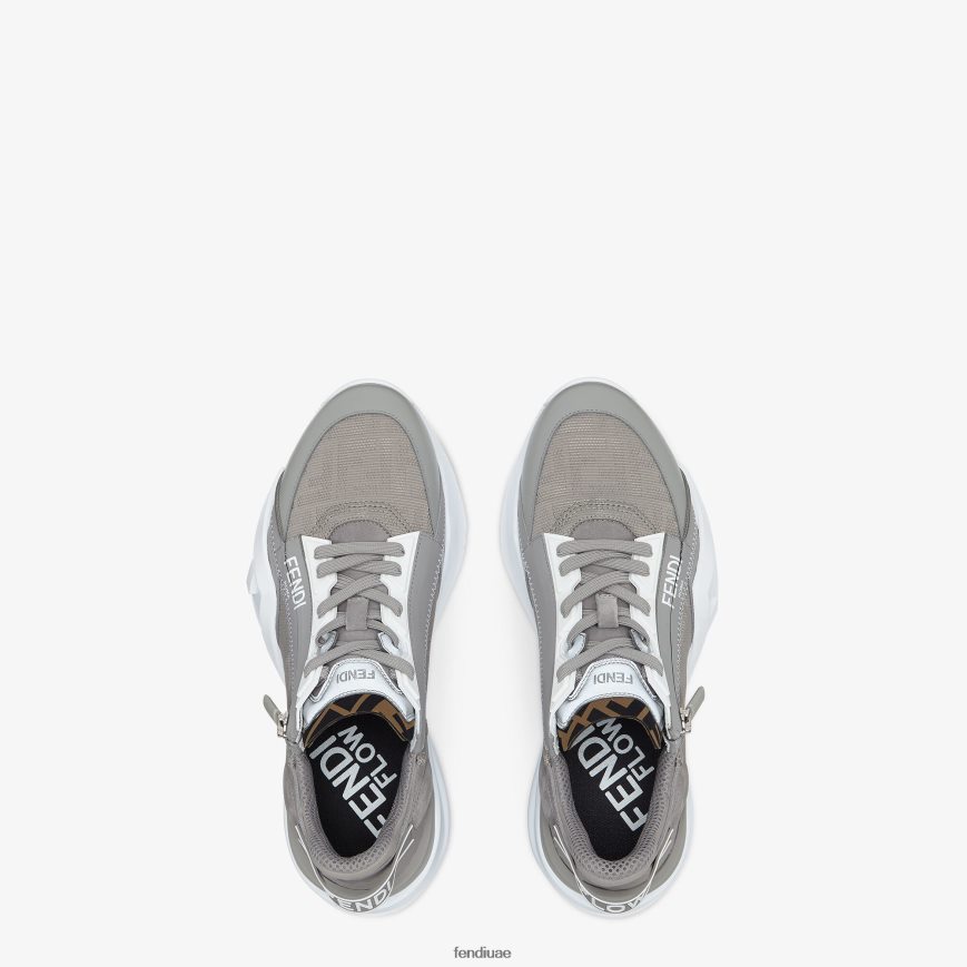 حذاء رياضي سهل الارتداء بأربطة مطاطية، وسحاب جانبي، ونعل مموج مع نقش F. حروف فندي المتدفقة منقوشة على الكعب. مصنوع من النايلون الرمادي المتجدد مع تصميم جاكار ff وتفاصيل من جلد الغزال بدرجة اللون. مزين بتفاصيل ليكرا مع شعار ff. نعل مصنوع من مطاط أبيض خفيف الوزن مع تفاصيل قطرية متطابقة اللون.