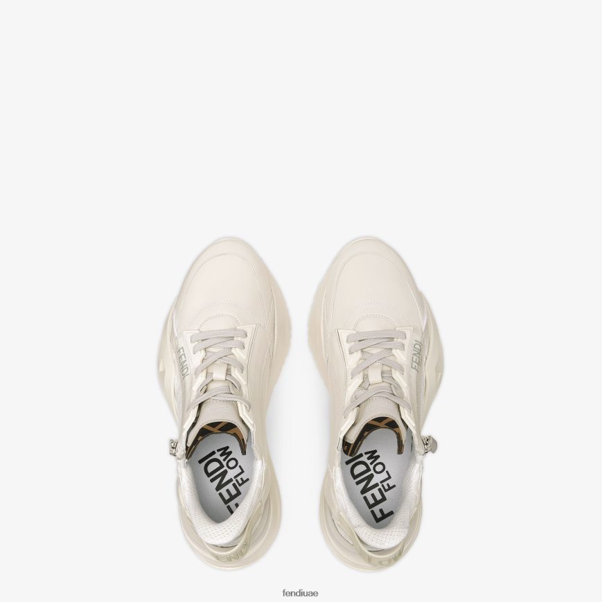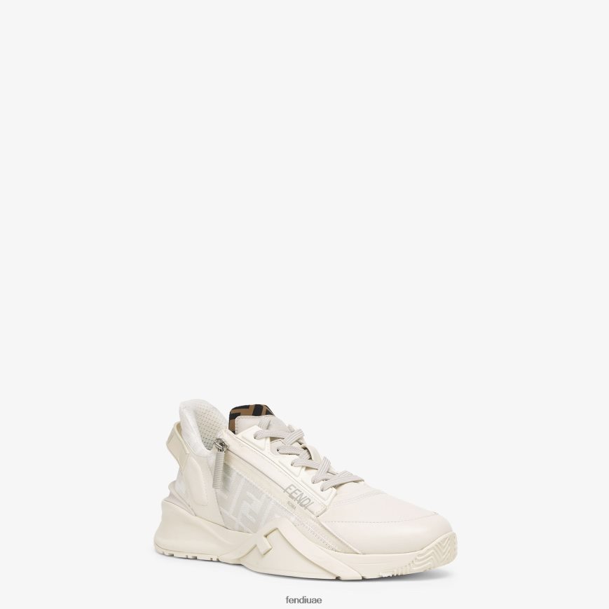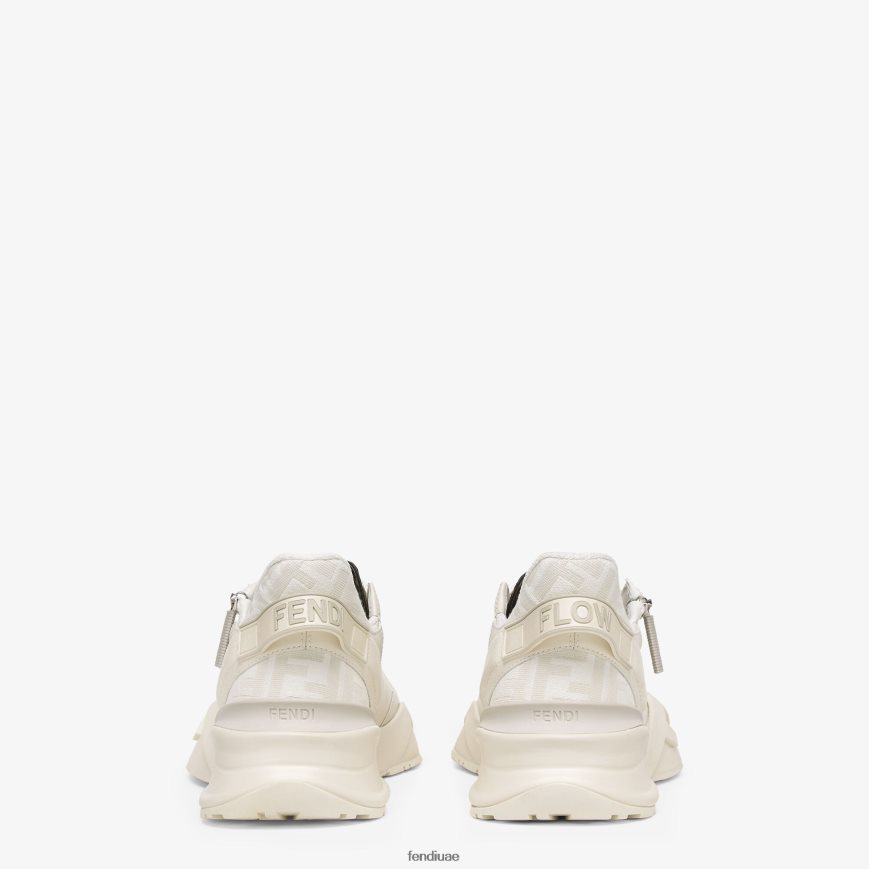 حذاء رياضي سهل الارتداء بأربطة مطاطية، وسحاب جانبي، ونعل مموج مع نقش F. حروف فندي المتدفقة منقوشة على الكعب. مصنوع من الجلد الأبيض وقماش ff باللون الأبيض والرمادي الفاتح. مزين بتفاصيل ليكرا مع شعار ff. نعل مطاطي أبيض خفيف الوزن مع تفاصيل قطرية متطابقة.