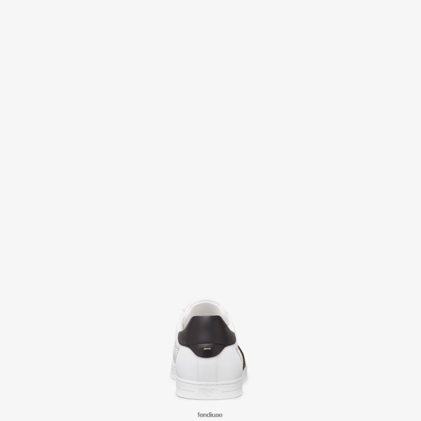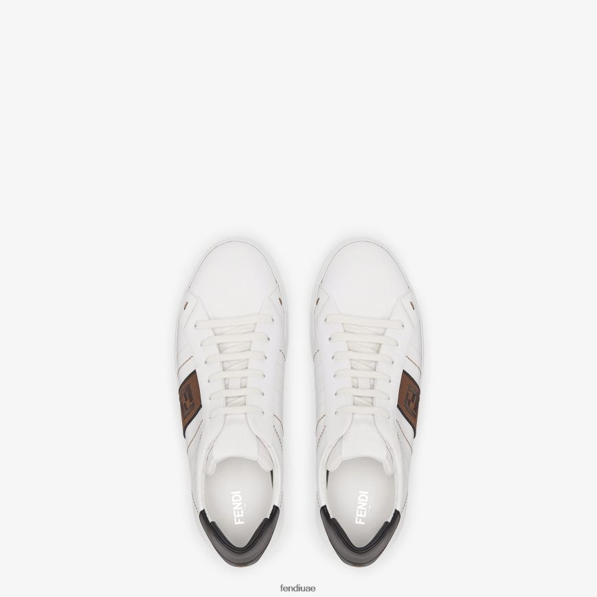 أحذية رياضية برباط. نعل مربع مطاطي. مصنوعة من جلد العجل الأبيض. مزين بشريط من قماش الجاكار مع شعار ff مطرز بدرجات اللون البني. كعب مغطى بالجلد الأسود.