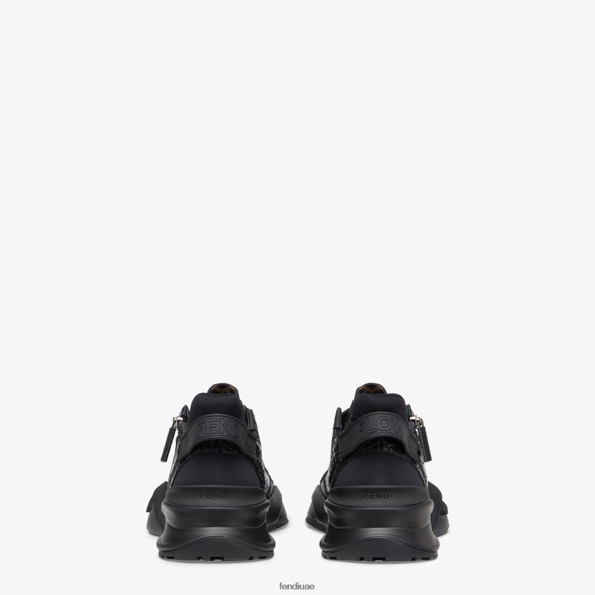 حذاء رياضي سهل الارتداء مع أربطة مرنة قابلة للتعديل، وسحاب جانبي، ونعل مموج مع نقش F. حروف فندي المتدفقة منقوشة على الكعب. مصنوع من جلد الكيمان الأسود. مزين بلسان ليكرا بزخارف ff. نعل مصنوع من مطاط أبيض خفيف الوزن مع تفاصيل قطرية سوداء.