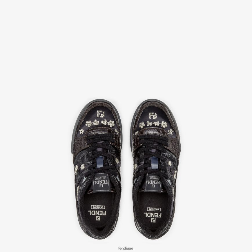 أحذية فندي الرياضية ذات الأربطة. مصنوع من الكيمان البني الداكن مع تفاصيل من النايلون الأسود. مزين بالتطريز بالخرز. نعل مطاطي مع حروف فندي على الجانب.