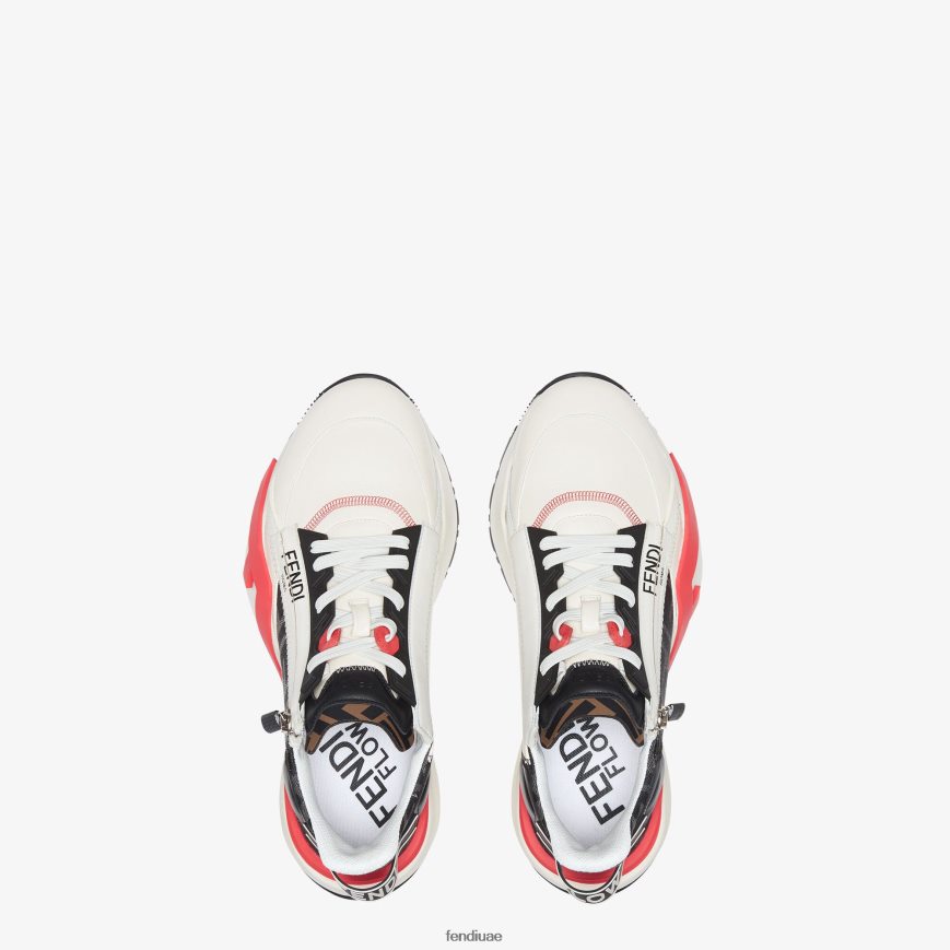 حذاء رياضي سهل الارتداء بأربطة مرنة وسحاب جانبي ونعل مموج مع نقش F. حروف فندي المتدفقة منقوشة على الكعب. مصنوع من الجلد الأبيض وقماش ff باللونين الأسود والرمادي. مزين بتفاصيل ليكرا مع شعار ff. نعل مصنوع من مطاط أبيض خفيف الوزن مع تفاصيل قطرية حمراء.