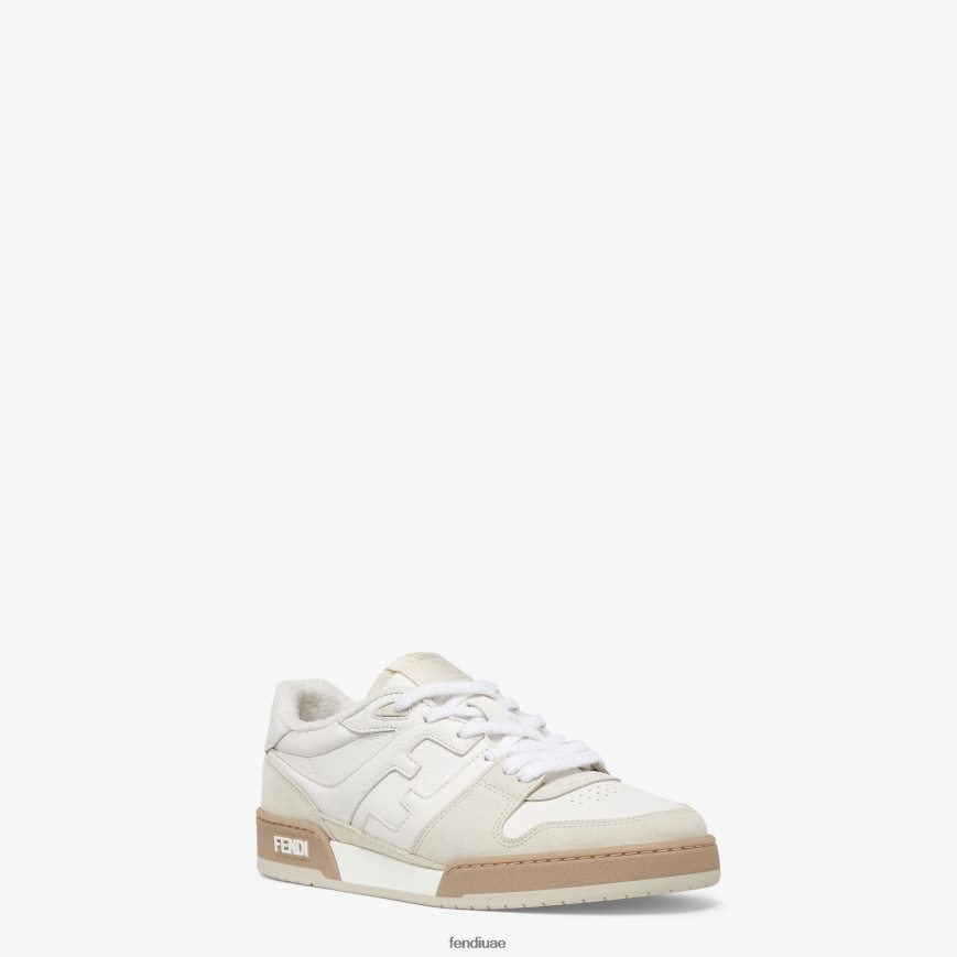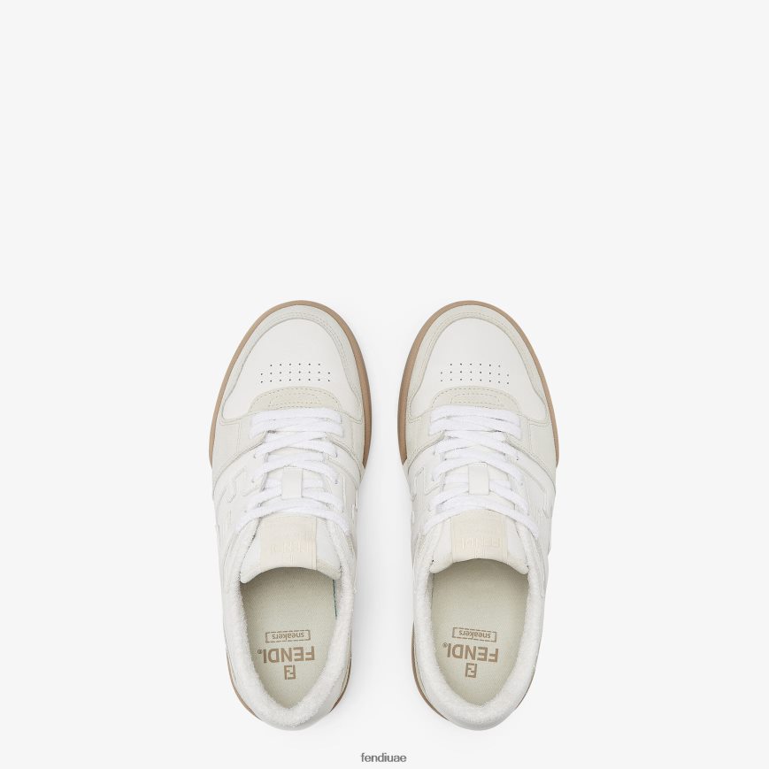 حذاء فندي الرياضي ذو التصميم المضغوط مع ملصق عتيق على اللسان. يحمل العلامة التجارية بنمط ff مخيط على الجانب وحروف فندي منقوشة على النعل. مصنوع من جلد الغزال الأبيض والجلد. مزين بنبرة على ياقة تيري وأربطة. نعل مطاطي مغطى بمصد بيج.