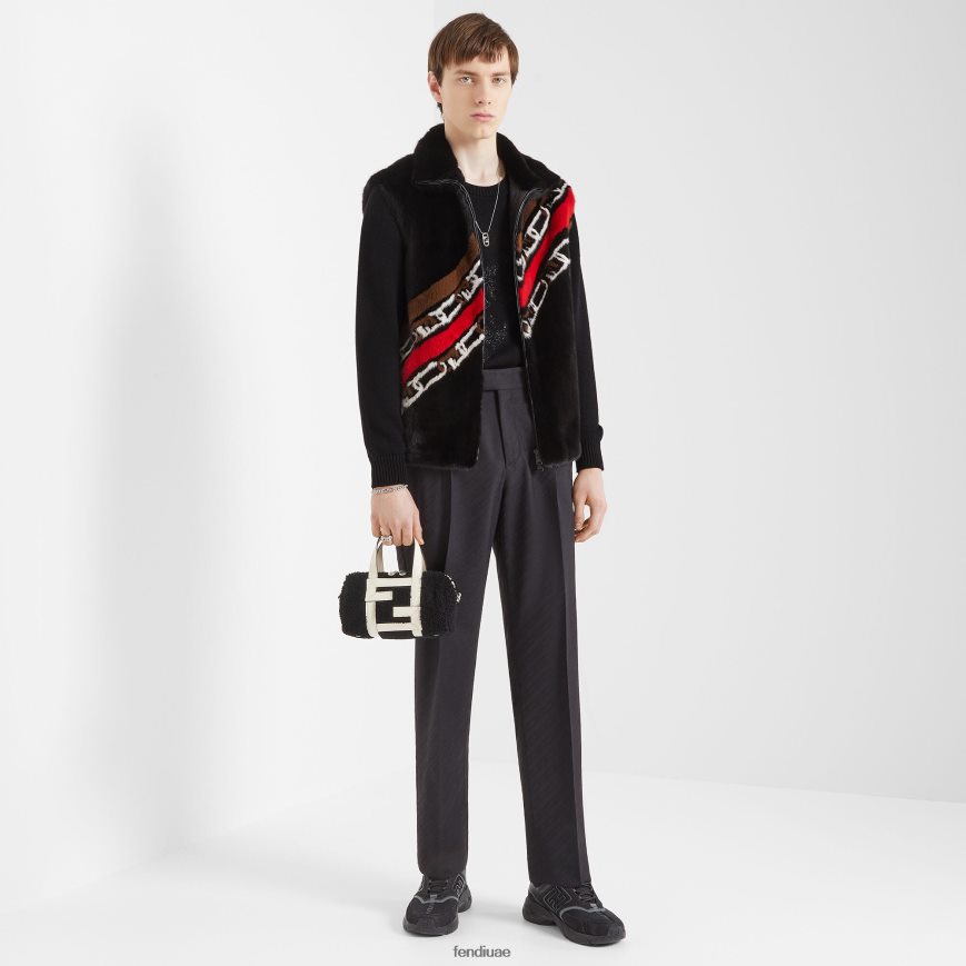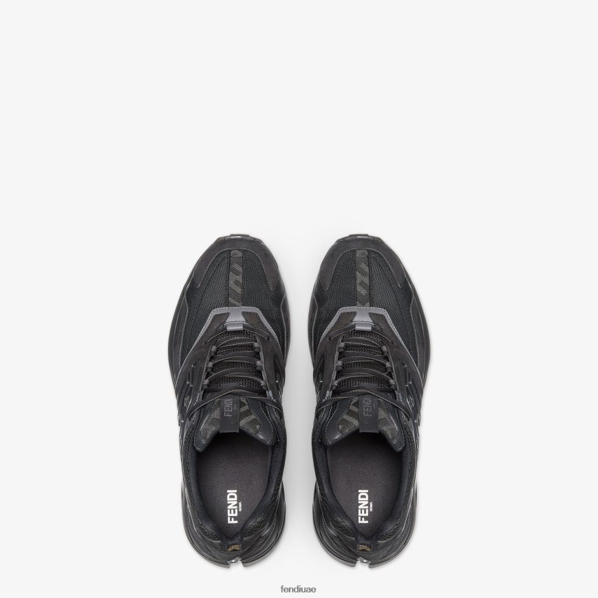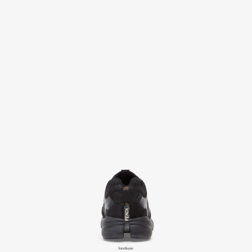 حذاء رياضي للجري مع شعار ff منقوش على الجوانب. باطن مموج مع ff على أصابع القدم. مصنوع من جلد نوبوك باللون الأسود مع تفاصيل جلدية متناغمة. تم تشطيبه بإدخالات من القماش باللونين الرمادي والأسود.