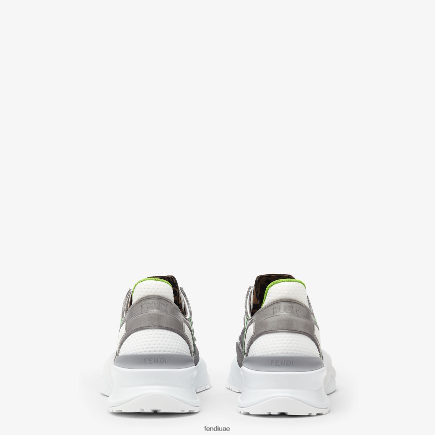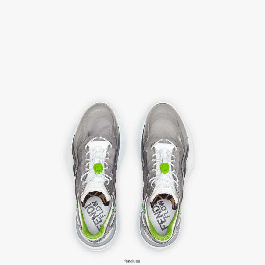 حذاء رياضي سهل الارتداء مع أربطة مرنة قابلة للتعديل وسدادة ff ونعل مموج مع نقش f. حروف فندي المتدفقة منقوشة على الكعب. مصنوع من النايلون الرمادي مع طلاء محقون. تفاصيل ليكرا مع شعار ff. نعل مطاطي أبيض خفيف الوزن مع تفاصيل قطرية بدرجة لون.