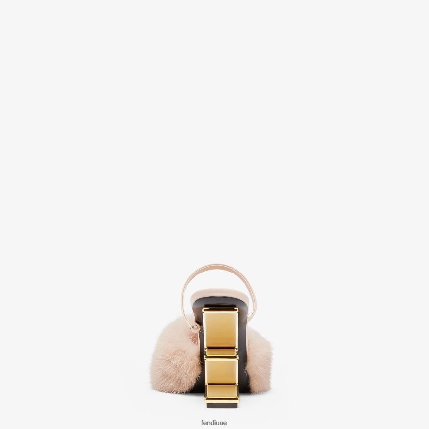 صندل فندي الأول ذو شريط وحزام عريض. مصنوعة من المنك الوردي الشاحب. تفاصيل جلدية متناغمة. كعب منحوت على شكل حرف F من المعدن الذهبي اللون.