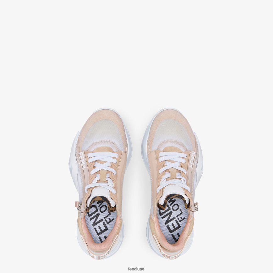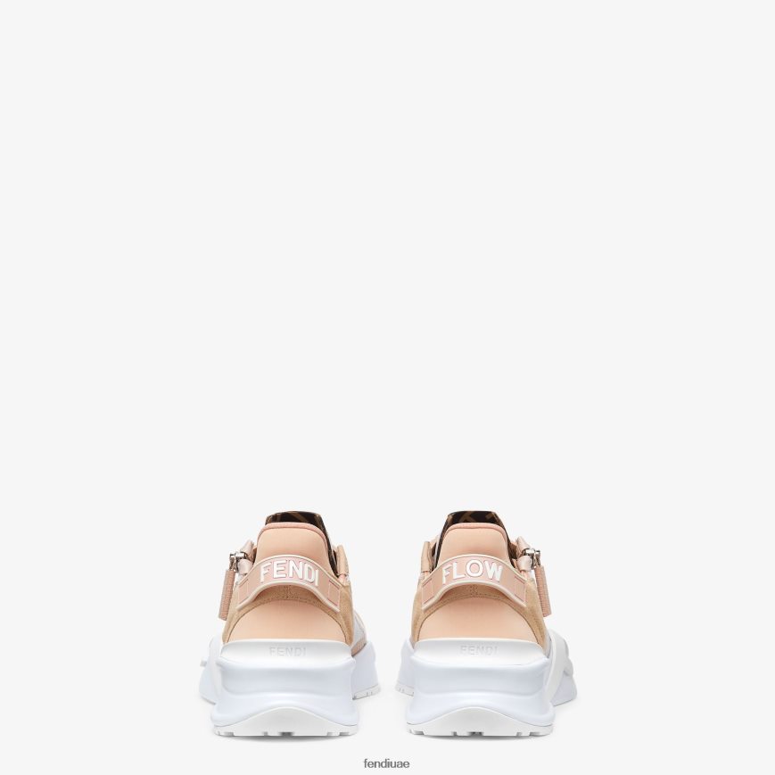 تم تقديم أحذية فندي الرياضية خلال عرض أزياء فندي لخريف وشتاء 2020 للرجال، وتتميز بتصميم قريب ومدعوم يتكيف بشكل مثالي مع خزانة الملابس الرجالية والنسائية. يحتوي الجزء العلوي على أربطة مرنة قابلة للتعديل وسحاب جانبي لارتدائها وخلعها بشكل مريح وسريع. يُعد شعار ff الموجود على حافة اللسان والشريط المطاطي على الكعب مع حروف فندي المرتفعة تفاصيل أيقونية ومميزة. يتم استكمالها بنعل مطاطي مقاس 35 مم مزين بنقش قطري f. هذا الطراز مصنوع من النايلون والسويدي بظلال من اللونين الوردي والأبيض ومصمم للمجموعة النسائية.