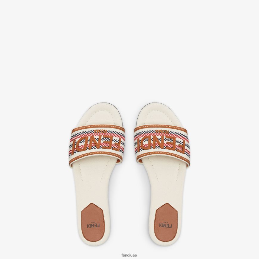 شرائح واسعة النطاق. مصنوع من قماش باللون البيج مع تطريز جرافيكي باللونين الأحمر والأزرق. لمحات من الجلد البني وحروف فندي. كعب 10 ملم.