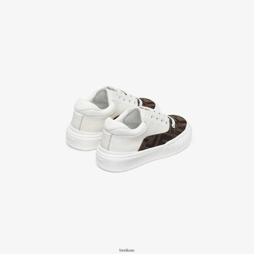 حذاء رياضي Fendi Force Mini Me First Steps برباط، يتميز بياقة مبطنة ونعل عالي من المطاط ذو العلامة التجارية مع نقش FF منقوش على مقدمة القدم. مصنوع من الجلد الأبيض. تم تشطيبه بقماش على مقدمة القدم يتميز بزخرفة ff في التبغ.