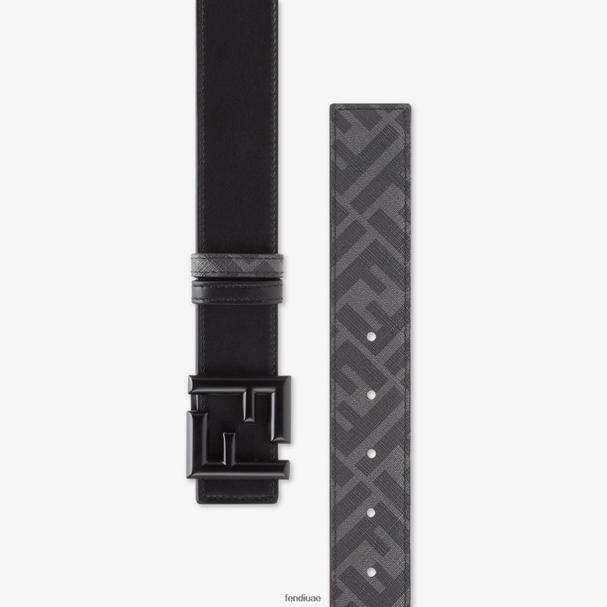 حزام ذو وجهين مع إغلاق مسمار مستدير ff. مصنوع من الجلد الأسود. بطانة من القماش بزخارف ff باللونين الرمادي والأسود. أدوات معدنية مطلية باللون الأسود.