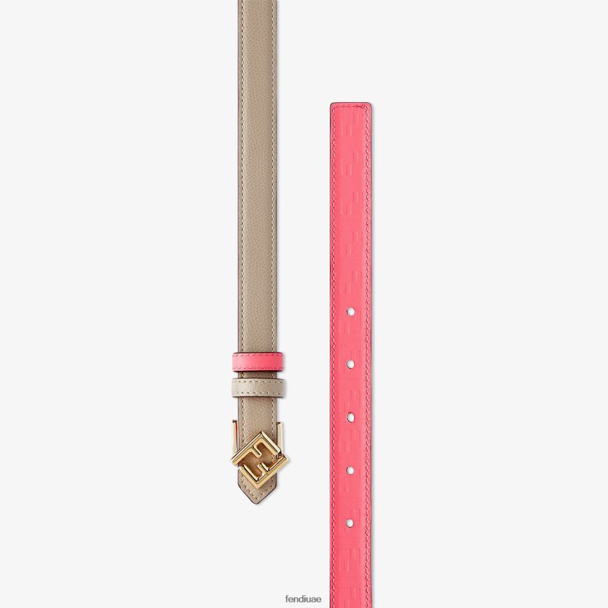 حزام ذو وجهين بحلقة وإبزيم قطري على شكل حرف FF. أحد الجانبين مصنوع من الجلد باللون البيج والآخر من الجلد الوردي مع نقش ff منقوش بدرجة لونية. أدوات معدنية مطلية بالذهب.