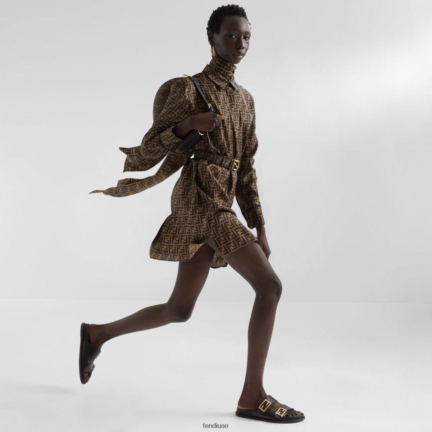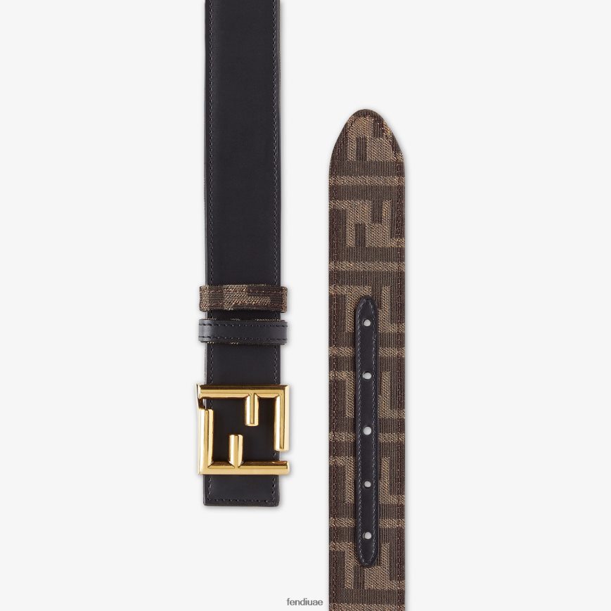 حزام ذو وجهين مع حلقة وإبزيم مسمار ff الشهير. مصنوع من الجلد الأسود على أحد الجانبين والقماش مع شعار ff باللون البني والتبغ على الجانب الآخر. أدوات معدنية مطلية بالذهب.