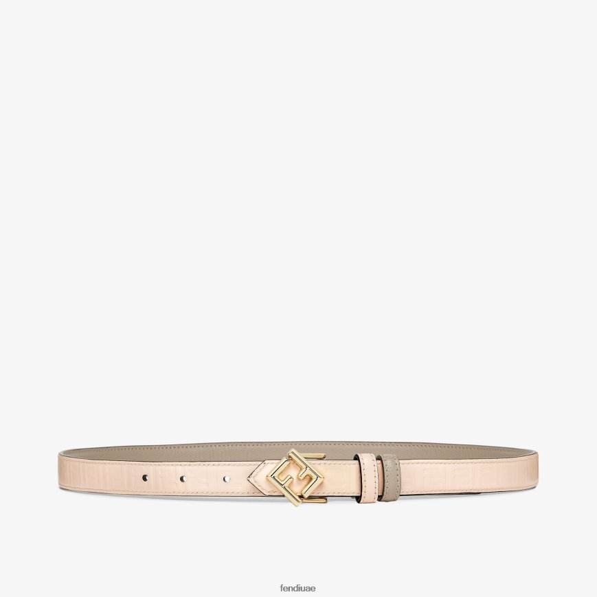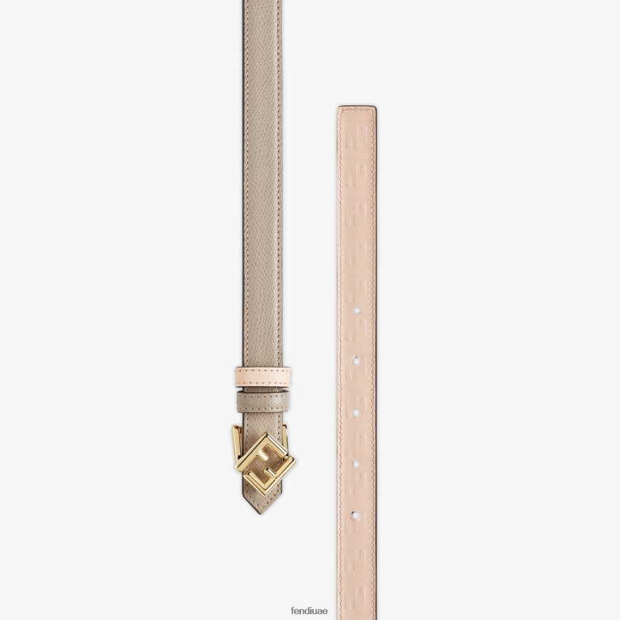 حزام ذو وجهين بحلقة وإبزيم قطري على شكل حرف FF. مصنوع من الجلد باللون الرمادي الفاتح على أحد الجانبين والجلد باللون الوردي الفاتح مع طبعة FF منقوشة على الجانب الآخر. أدوات معدنية مطلية بالذهب.