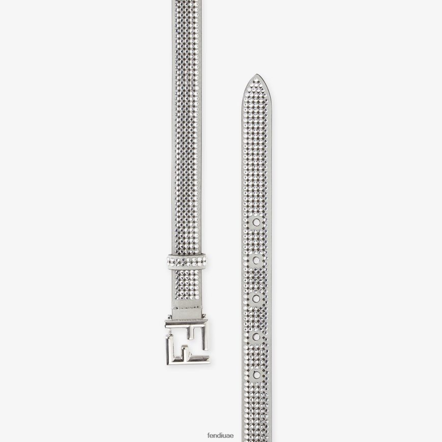 حزام رفيع مزود بحلقة وإبزيم مسمار ff مميز. مصنوع من جلد نوبوك باللون الرمادي، ومزين بالكريستال في كل مكان. أدوات معدنية مطلية بالبلاديوم.