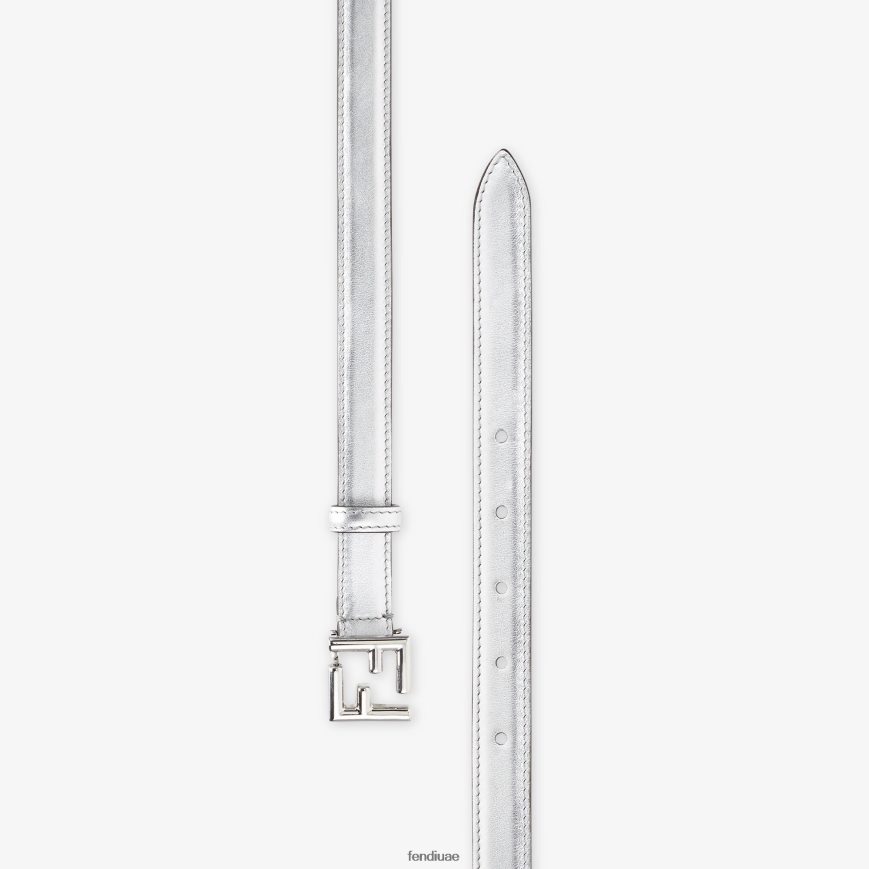 حزام رفيع مزود بحلقة وإبزيم مسمار ff مميز. مصنوع من الجلد المصقول باللون الفضي. أدوات معدنية مطلية بالبلاديوم.