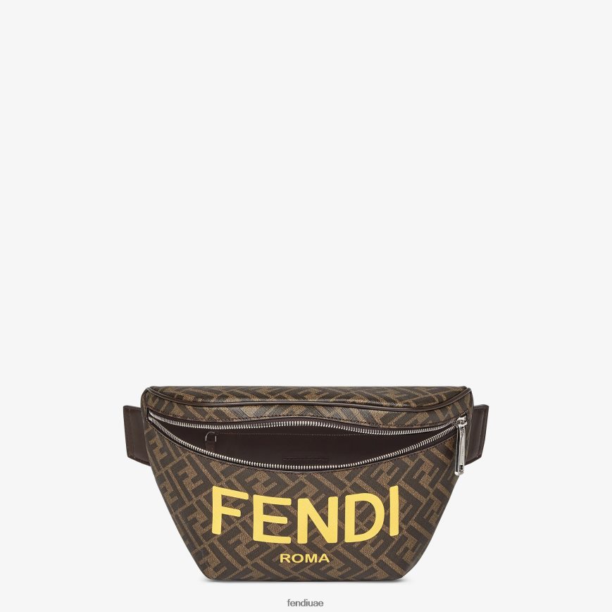 حقيبة حزام مصنوعة من قماش منسوج مع شعار ff بني وطبعة فندي روما باللون الأصفر.