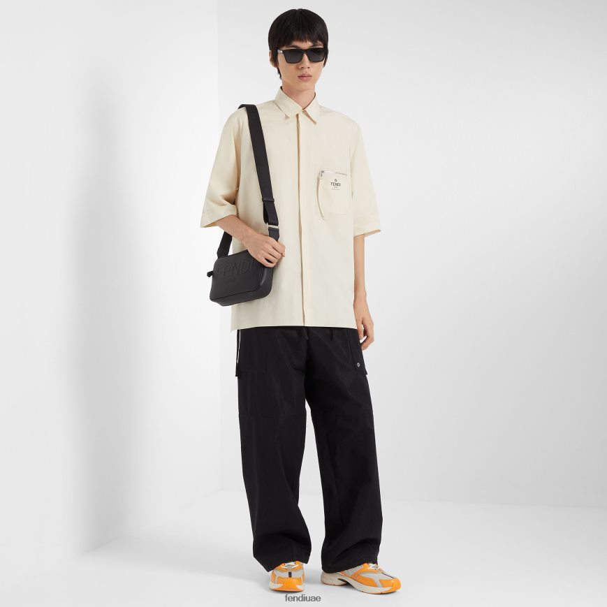 حقيبة كتف مدمجة من الجلد الأسود المحبب بالكامل مع شعار فندي روما ثلاثي الأبعاد. إبزيم بسحاب وبطانة داخلية، أدوات معدنية مطلية بالبلاديوم. حزام الكتف من القماش الفني مع حروف فندي قابل للتعديل والفصل.