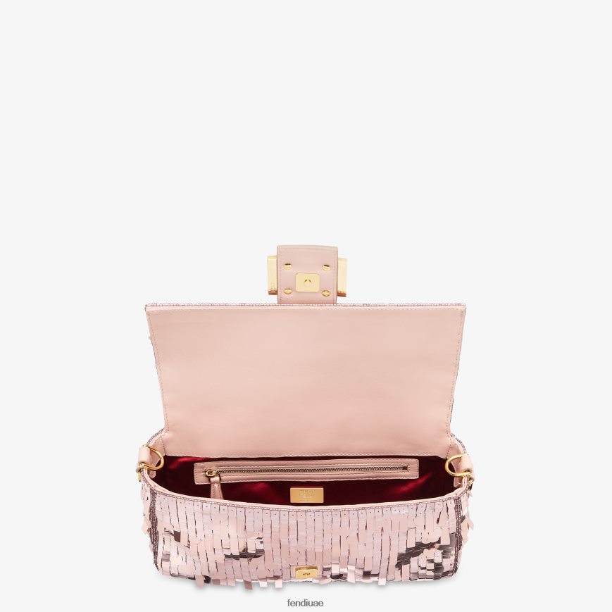 حقيبة باغيت متوسطة الحجم ومطرزة بالكامل بالترتر المعدني الوردي بأشكال وأحجام مختلفة. مزين بمشبك ff.