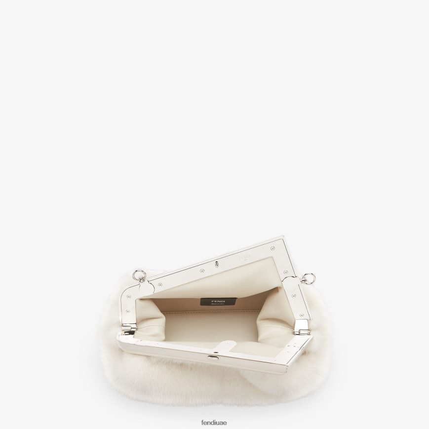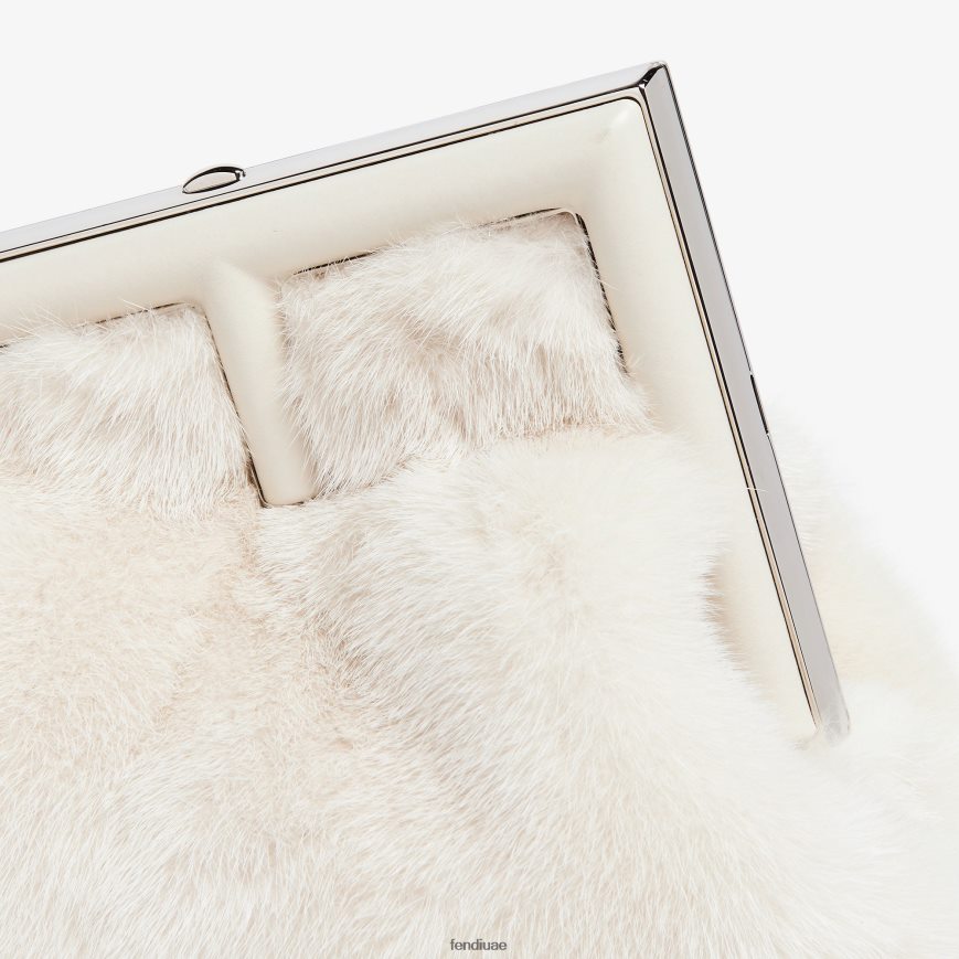 حقيبة فندي الأولى صغيرة مصنوعة من فرو المنك الناعم باللون الأبيض الفاتح مع مشبك معدني كبير الحجم مثبت على جلد نابا.