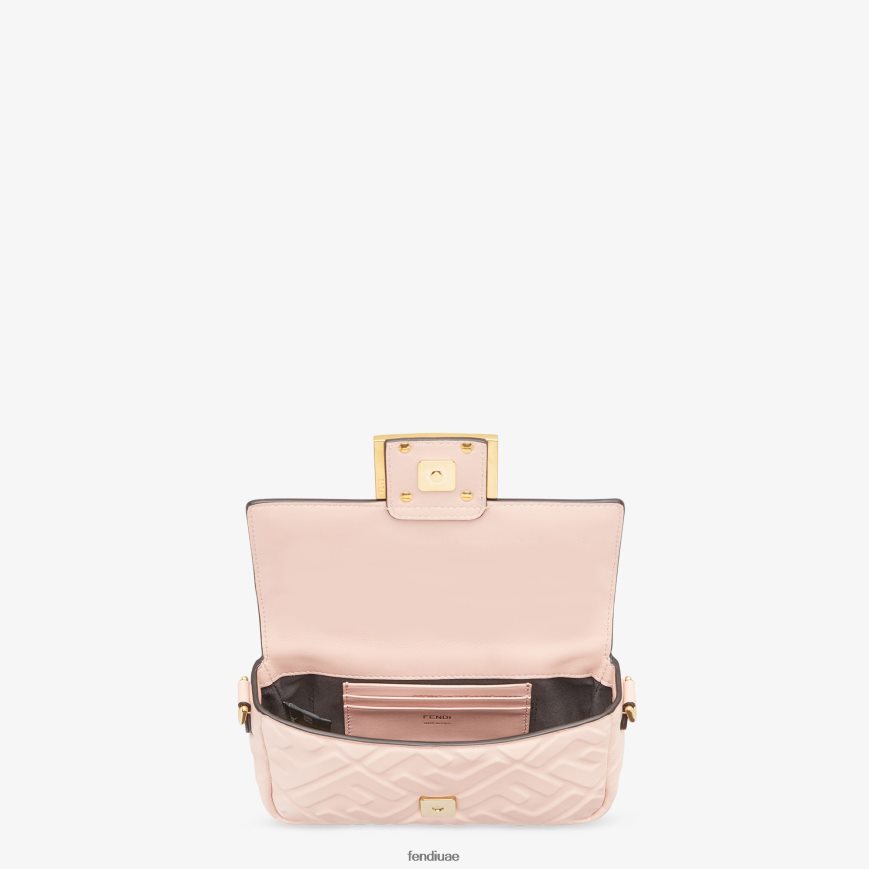حقيبة باغيت صغيرة أيقونية مصنوعة من جلد نابا الناعم باللون الوردي مع شعار ff منقوش ثلاثي الأبعاد. مزين بمشبك ff.