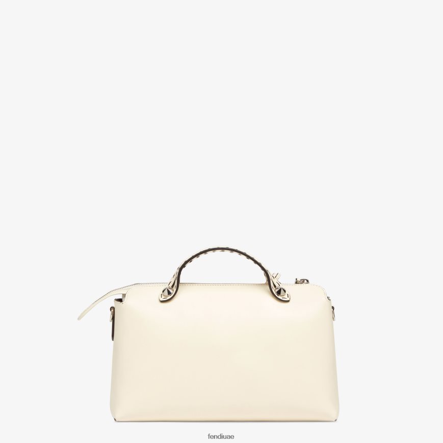 حقيبة متوسطة الحجم أيقونية باي واي بوسطن، مصنوعة من الجلد الأبيض مع ختم "فندي روما" الساخن وسحاب للإغلاق.