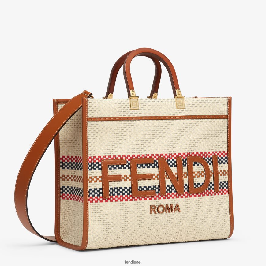 حقيبة تسوق صن شاين متوسطة الحجم مصنوعة من القماش بتأثير مضفر وخطوط بثلاثة ألوان. تتميز بحروف فندي روما بمقابض جلدية بنية ومتينة.