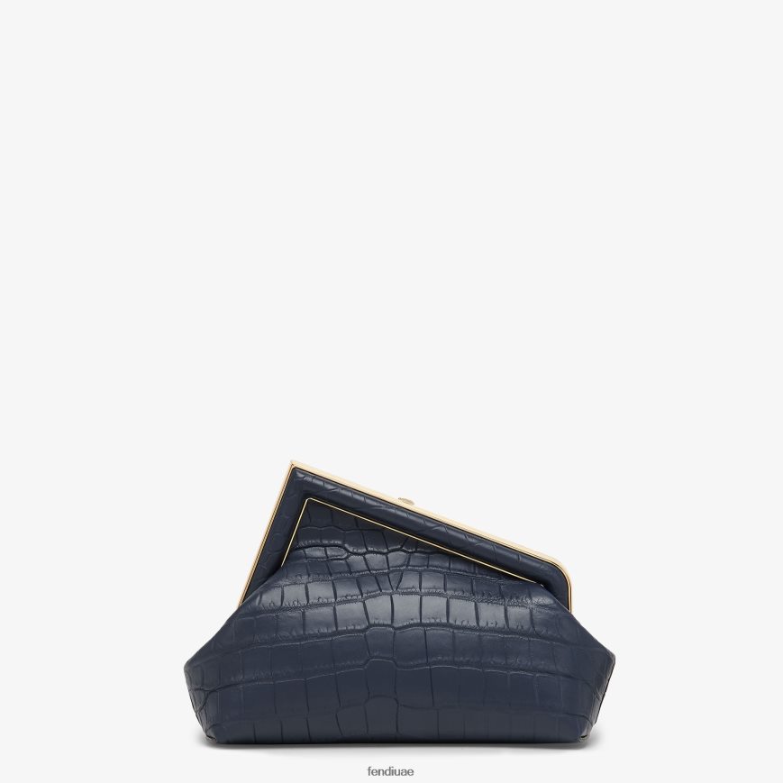 حقيبة فندي الأولى الصغيرة مصنوعة من جلد التمساح الرائع باللون الأزرق الداكن مع قفل معدني كبير الحجم مع زخرفة فاخرة على شكل رصيف كريستالي.