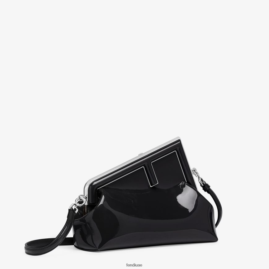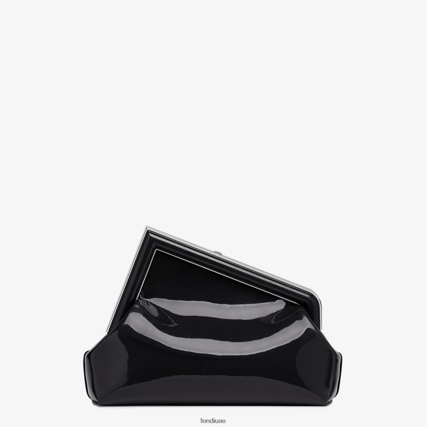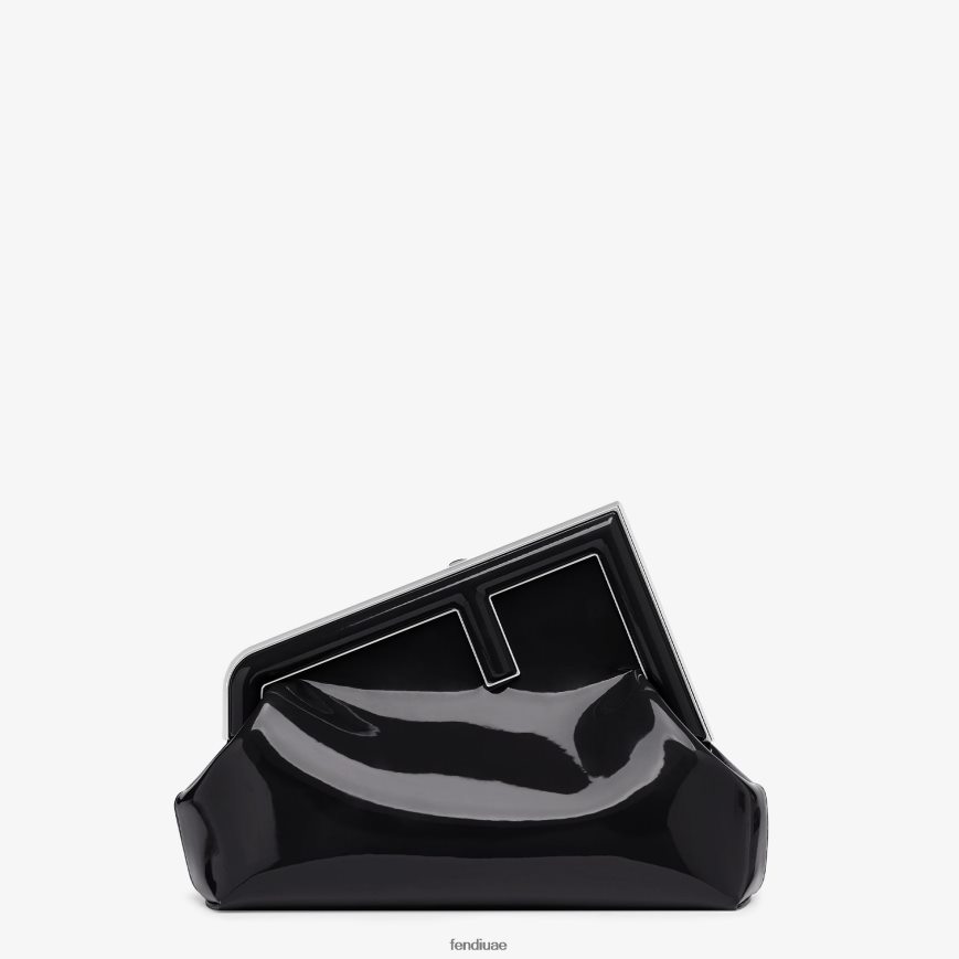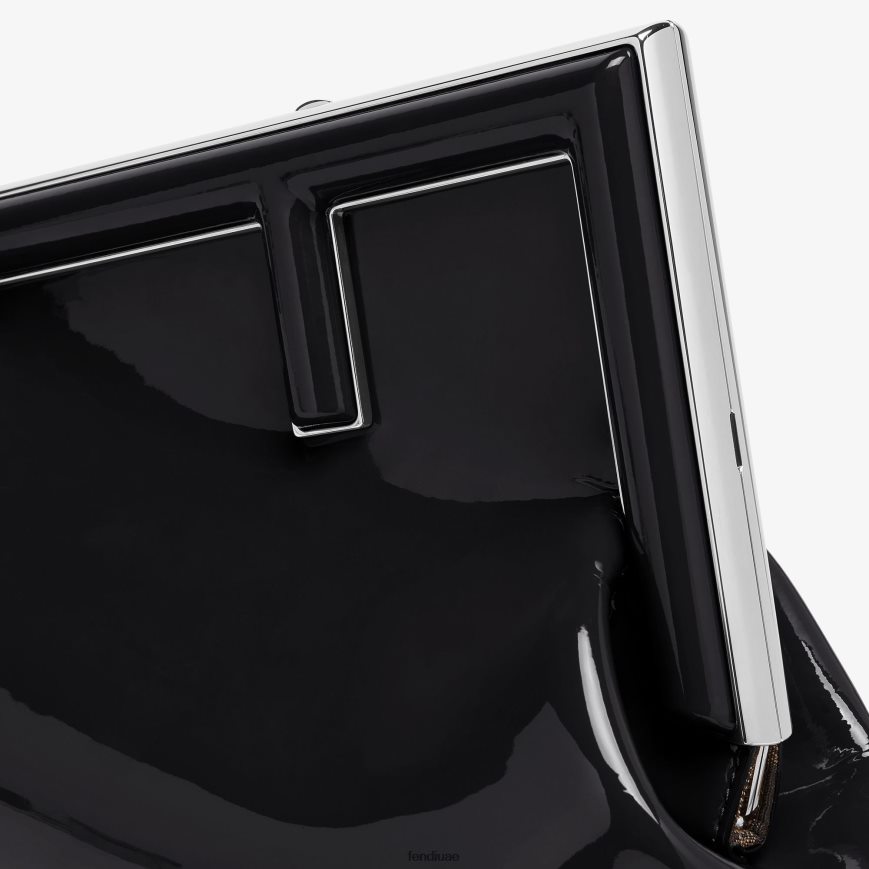 حقيبة فندي الأولى بحجم مثالي للنهار، مصنوعة من الجلد الأسود اللامع مع مشبك معدني كبير الحجم مربوط بالجلد اللامع.