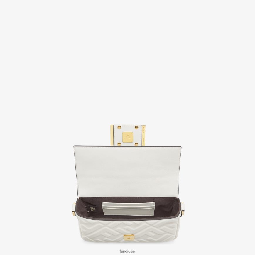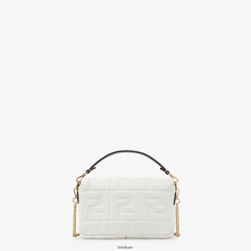 حقيبة باغيت صغيرة أيقونية مصنوعة من جلد نابا الناعم باللون الأبيض مع شعار FF ثلاثي الأبعاد. مزينة بإبزيم على شكل حرف ff.