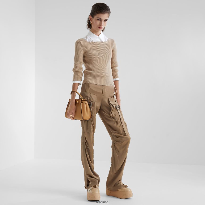 مميزة ببطانة من القماش باللون الوردي الفاتح مع شعار ff مطرز، وقسمين يفصل بينهما حاجز متين، وسحاب داخلي. جيب وأدوات معدنية مطلية بالذهب.