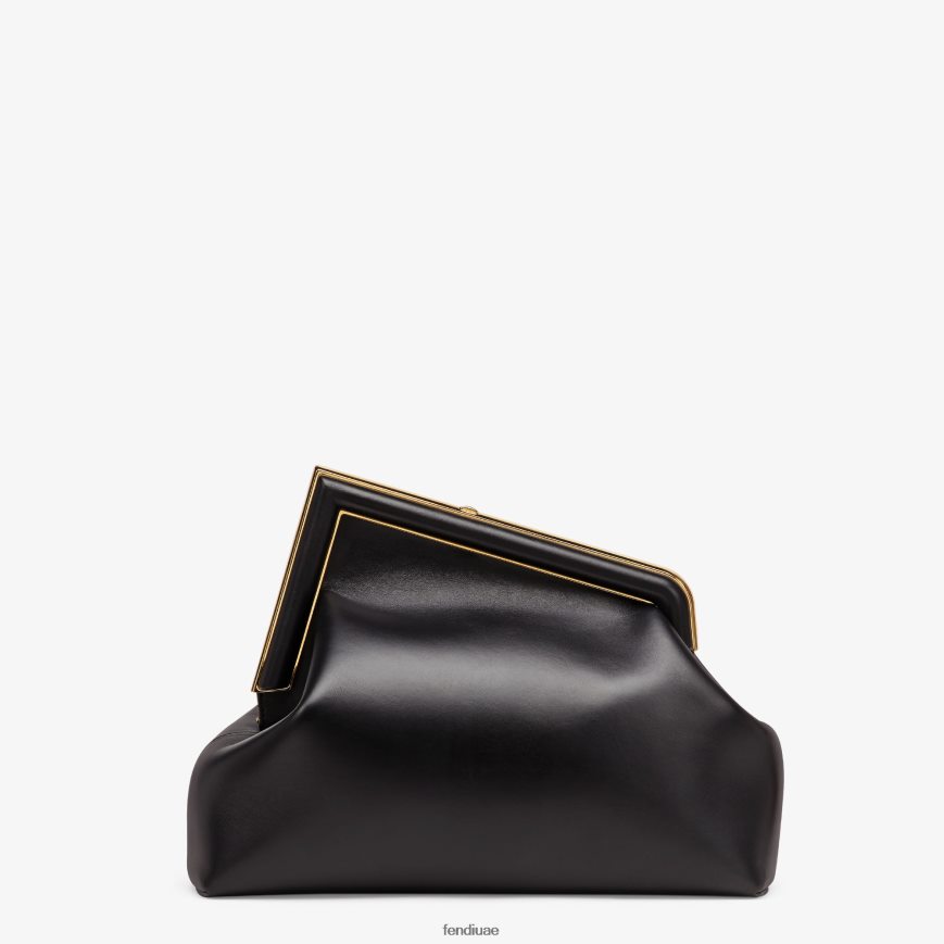 حقيبة فندي الأولى متوسطة الحجم مصنوعة من جلد نابا الناعم باللون الأسود مع مشبك معدني كبير الحجم مثبت على جلد نابا.