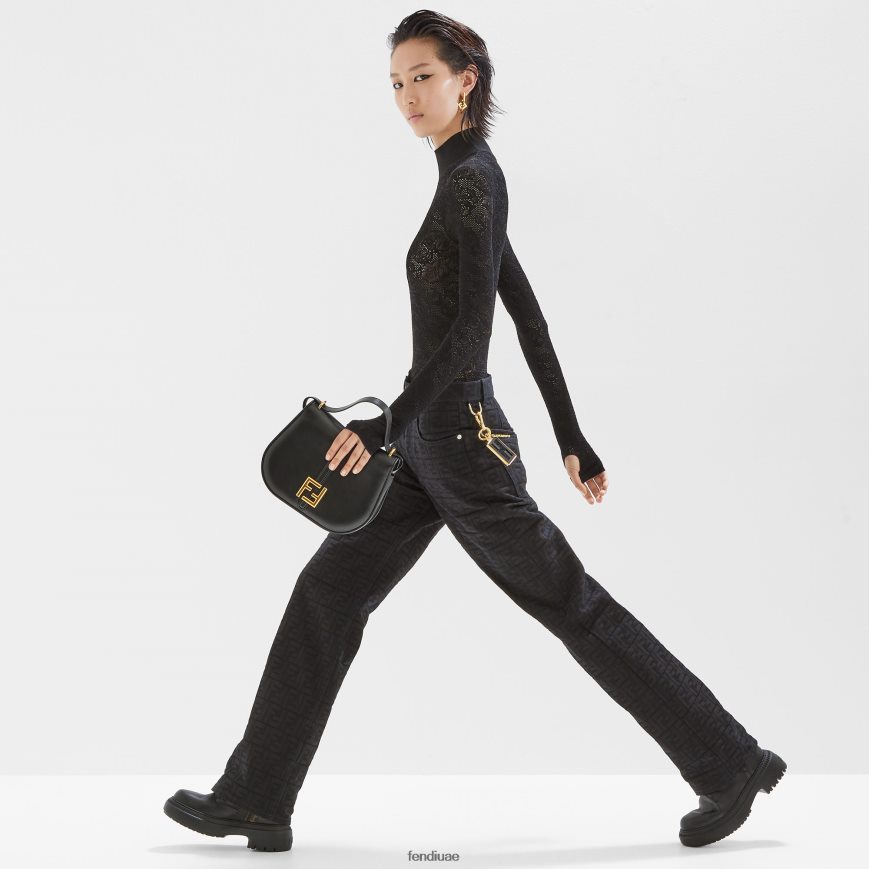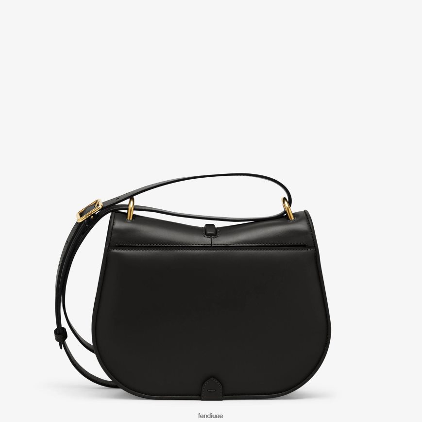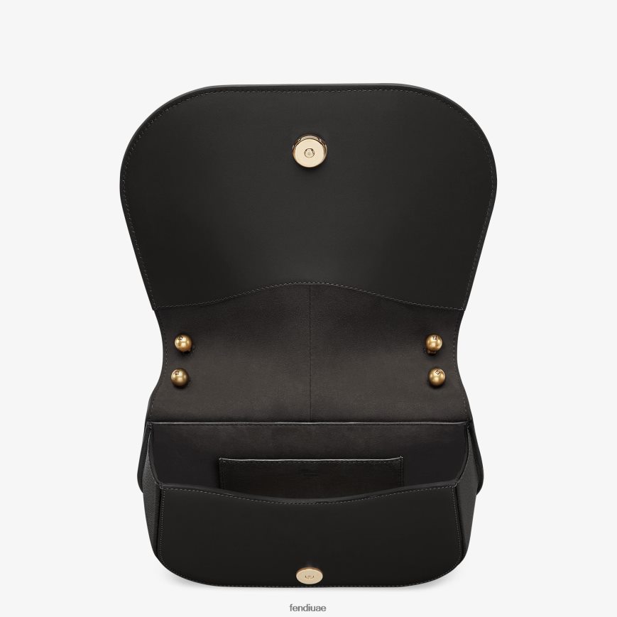 حقيبة متوسطة الحجم بخطوط أنثوية منحنية وغطاء ممدود مزين بشعار ff معدني. مصنوع من الجلد الأسود الناعم مع حواف وتفاصيل منقوشة. جوانب الحقيبة مصنوعة من جلد محبب بالكامل.