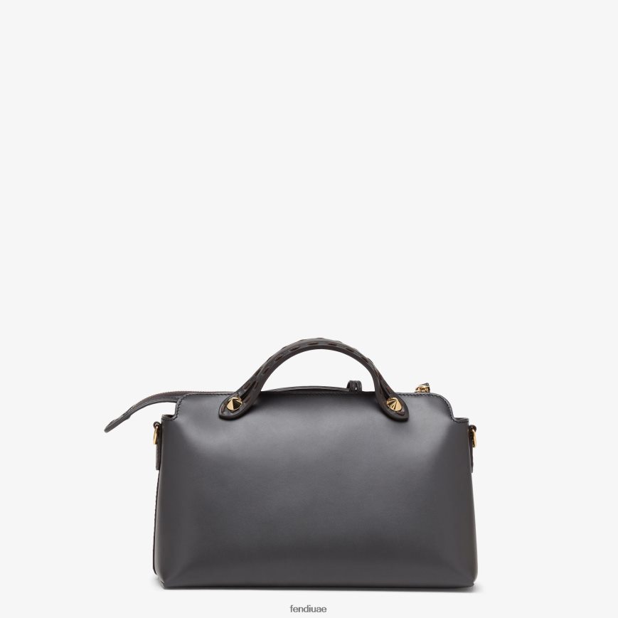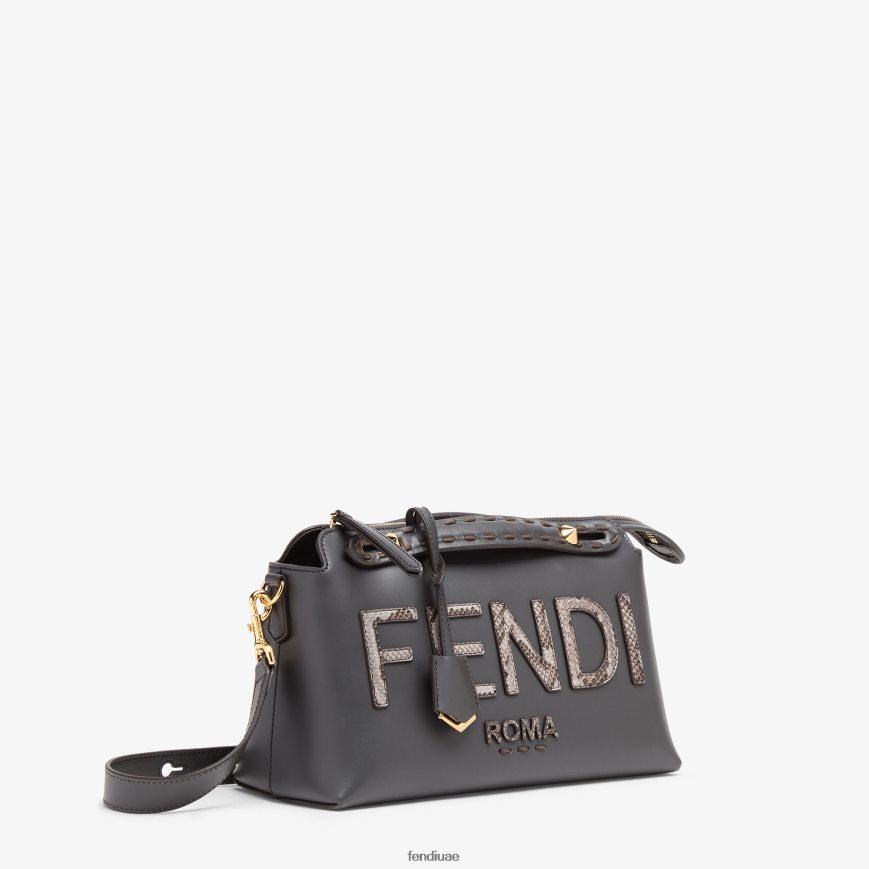 حقيبة باي ذا واي بوسطن المميزة المتوسطة الحجم مصنوعة من الجلد باللون الرمادي الداكن ومزينة بنقش "فندي روما" المطبوع بشكل ثعبان الثعبان وسحاب للإغلاق.