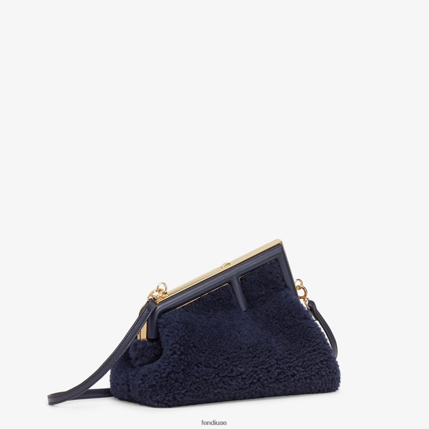 حقيبة فندي الأولى صغيرة مصنوعة من جلد الغنم الناعم باللون الأزرق الداكن مع مشبك معدني كبير الحجم مثبت على جلد نابا.