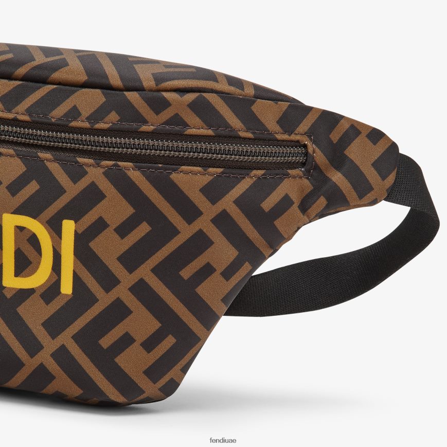 حقيبة على شكل حزام من النايلون بلون التبغ وطبعة فندي روما باللون الأصفر.