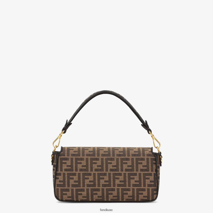 حقيبة باغيت متوسطة الحجم مميزة مصنوعة من قماش الجاكار البني مع شعار ff، ومزينة بمشبك ff ومزينة بتطريز أسود.
