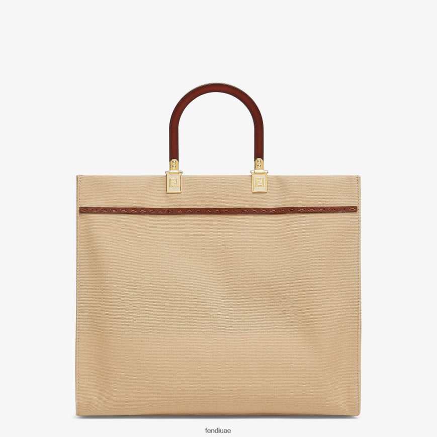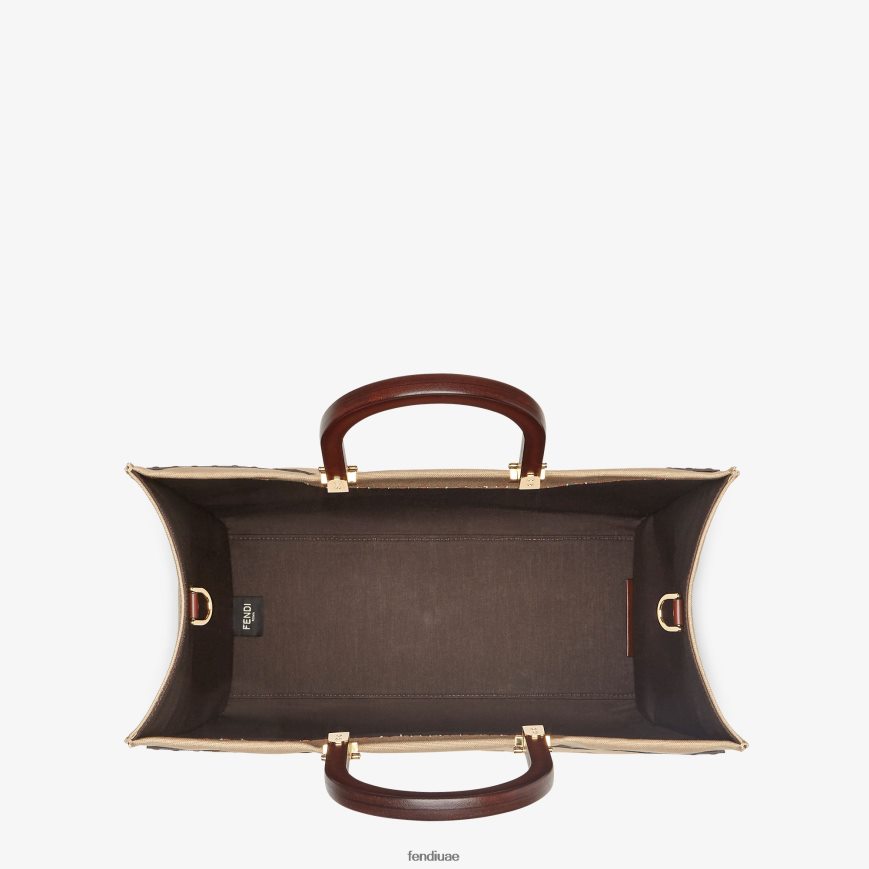 حقيبة تسوق متوسطة الحجم مصنوعة من قماش صن شاين باللون البيج، وتتميز بتطريز "فندي روما" بدرجة اللون على تطريز منقوش ومقابض جلدية صلبة.