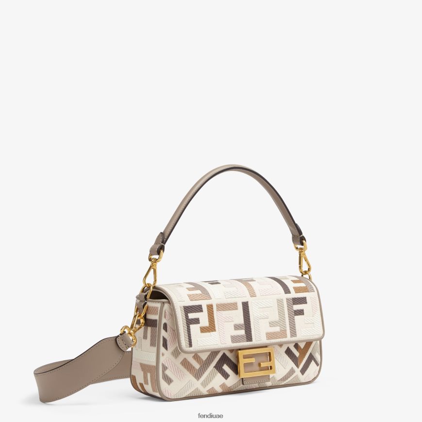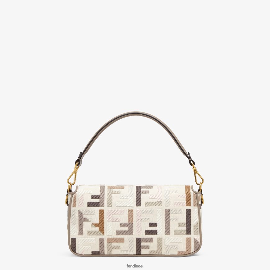حقيبة باغيت متوسطة الحجم أيقونية مصنوعة من القماش الطبيعي مع شعار ff بارز ومطرز بخيوط متعددة الألوان. مع لمسة نهائية من الجلد باللون الرمادي الفاتح ومزينة بقفل على شكل حرف FF.