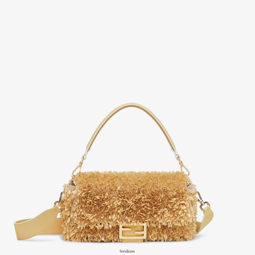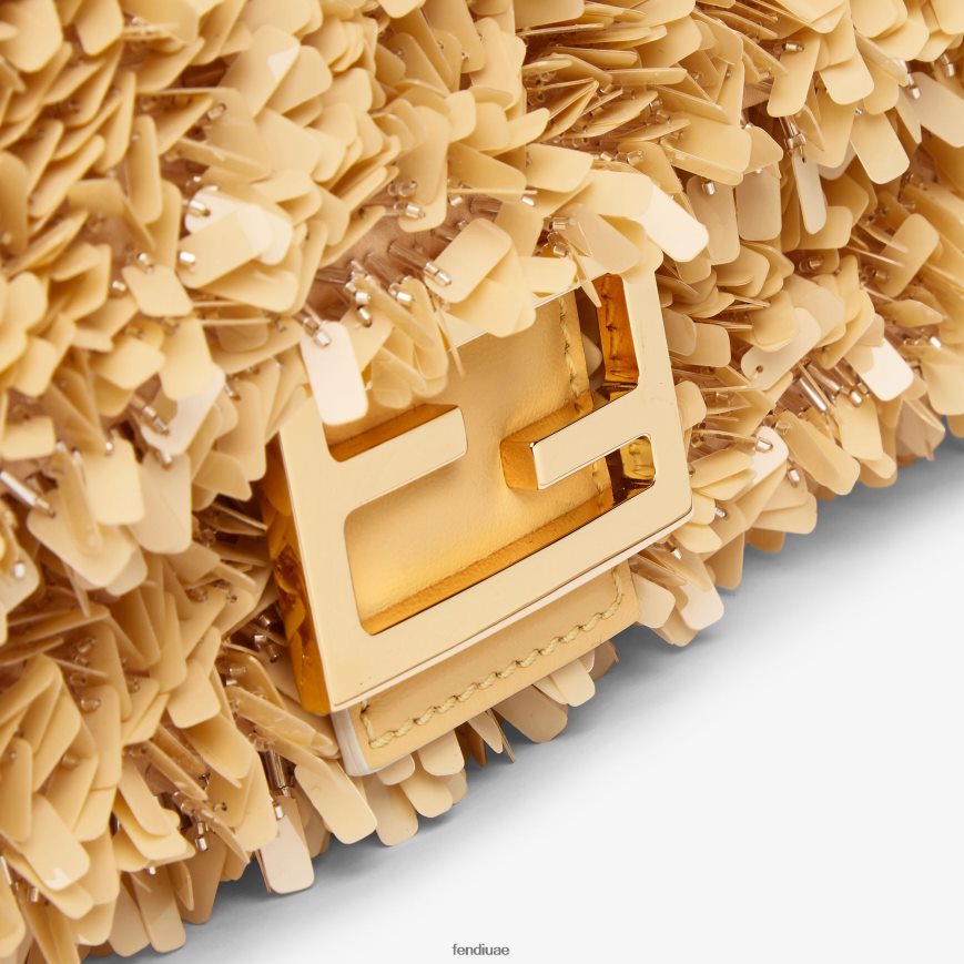حقيبة باغيت متوسطة الحجم ومزخرفة بشكل رائع بالترتر الرملي اللون والخرز والتطريز الذهبي لخلق تأثير متألق ثلاثي الأبعاد. مزين بمشبك ff.