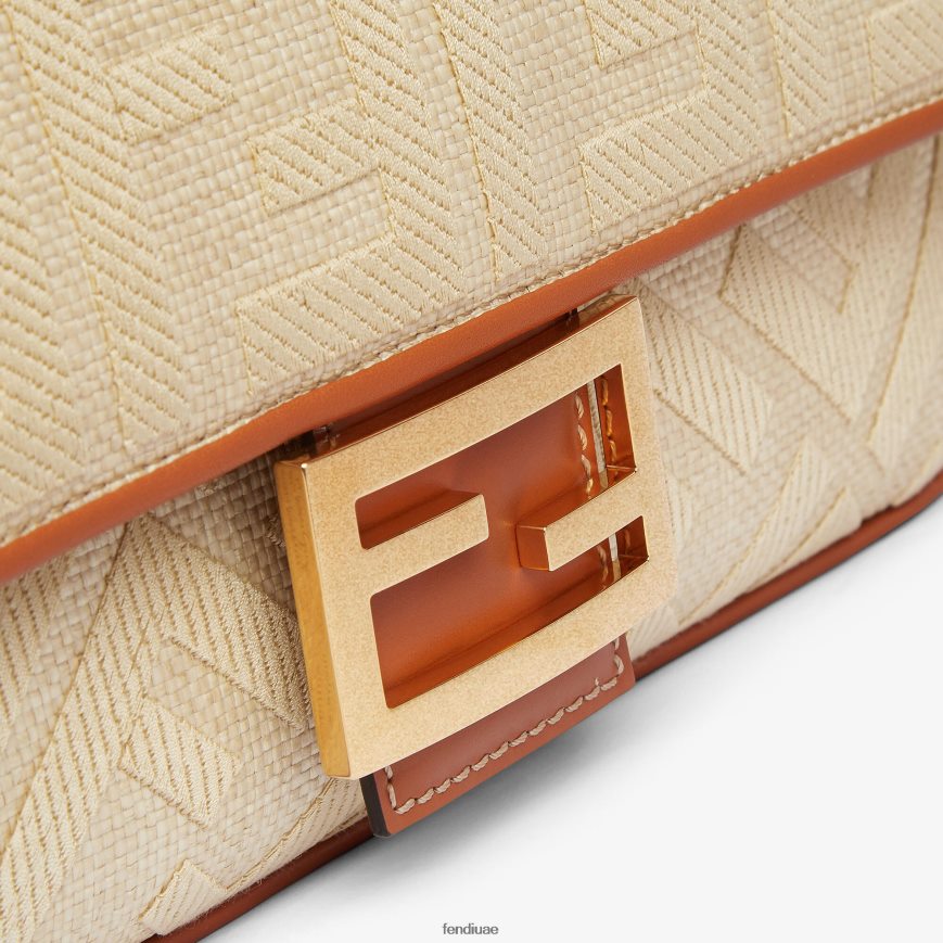 حقيبة باغيت متوسطة الحجم أيقونية مصنوعة من القش ذو اللون الطبيعي مع تطريز بارز على شكل حرف FF. مزينة بحواف من الجلد باللون البني ومشبك على شكل حرف FF.