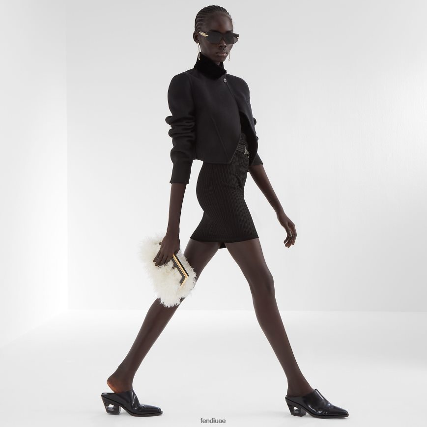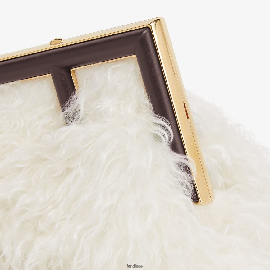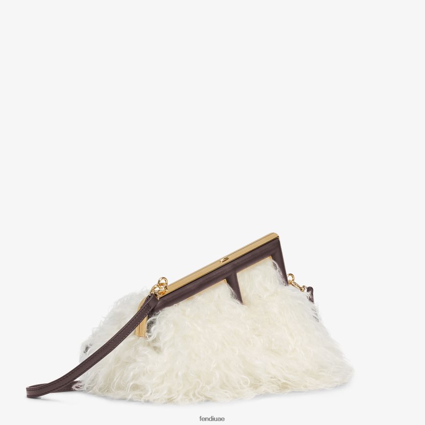 حقيبة فندي الأولى صغيرة مصنوعة من صوف الموهير بملمس فروي، ومزودة بمشبك معدني كبير الحجم على شكل حرف F مربوط بجلد نابا باللون البني الداكن.